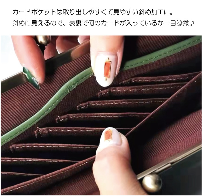 ★シンプルに、機能的。がま口型フォルムに必要分だけの仕切りをつけた、最も機能的なお財布が登場です♪★お札入れ×1、カート入れ×9 小銭入れ×1とてもしっかりしたつくりで,長く使えます。★カバンの中で場所を取らない薄型財布★スリムなデザインでポケットやバッグに収まりやすく、かつ開いた時の見易さにも拘りあり!★金具は金古美加工で優しい手馴染みの良い色合い。★楽にワンタッチで開閉できるガマ口財布。★カードポケットは取り出しやすくて見やすい斜め加工に。斜めに見えるので、表裏で何のカードが入っているか一目瞭然♪★自分用はもちろん、プレゼントとしても喜ばれる!実用性抜群なガマ口財布♪