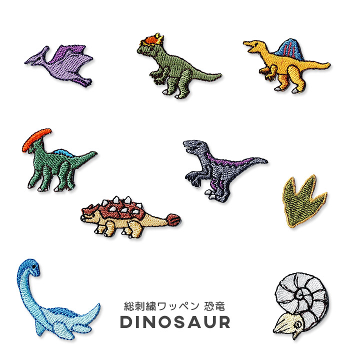 ポップなカラーが目を引く、当店オリジナルデザインの恐竜の総刺繍ワッペン。