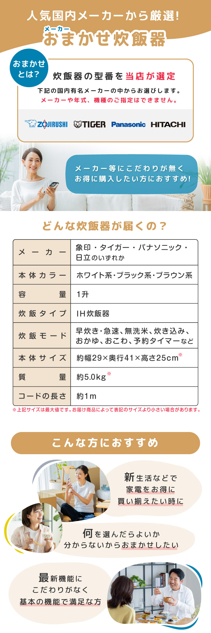 下記の国内有名メーカーの中から炊飯器の型番を当店が選定致します。
