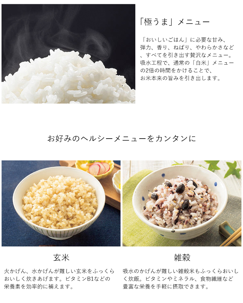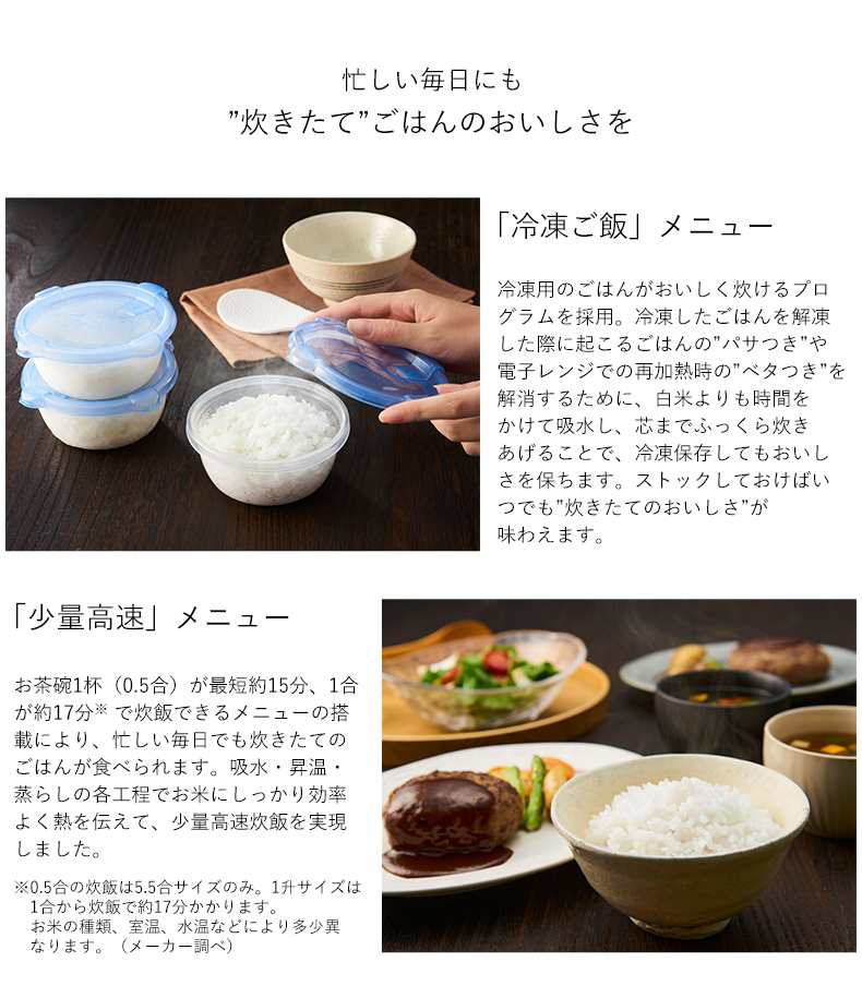 お茶碗1杯(0.5合)が最短約15分、1合が約17分※で炊飯できるメニューの搭載により、忙しい毎日でも炊きたてのごはんが食べられます。