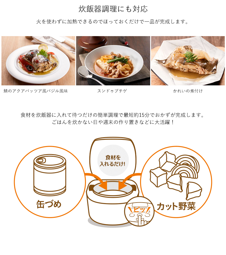 食材を炊飯器に入れて待つだけのかんたん調理で最短約15分でおかずが完成します。