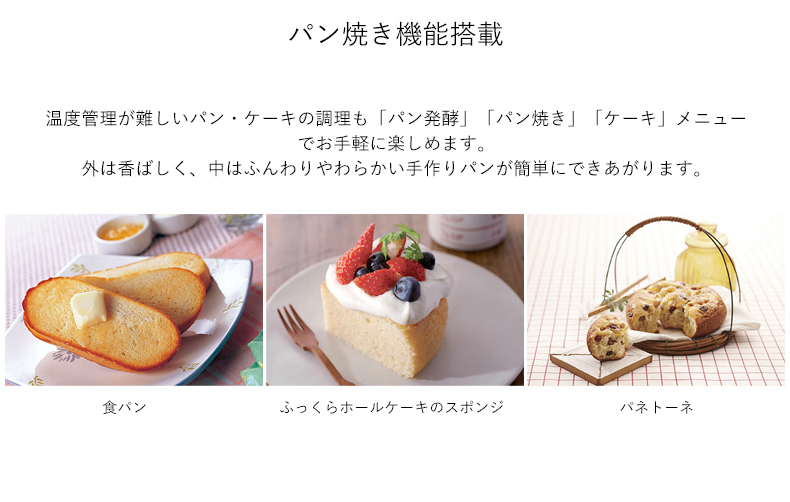 温度管理が難しいパンの調理も「パン発酵」「パン焼き」メニューでお手軽に楽しめます。