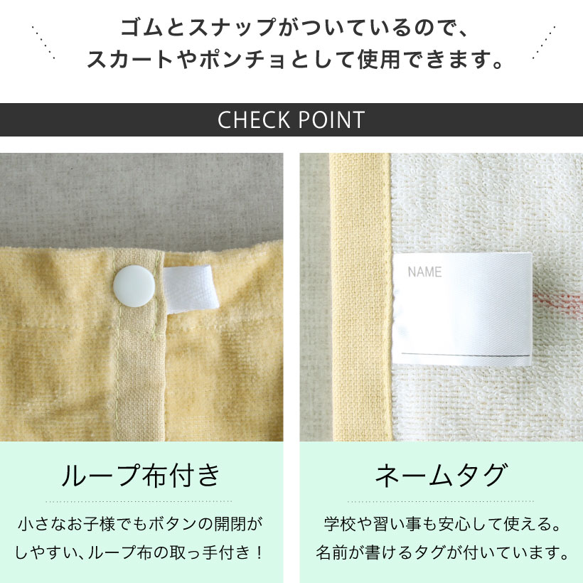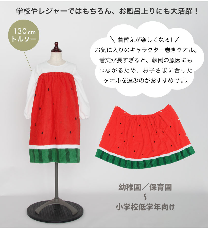 お着換えが楽しくなる、かわいいデザインの巻きタオル。ゴムとスナップボタンが付いているのでスカートやポンチョのようにして使用でき、ジムやお風呂上りや水泳の後などのお着替えにさっと巻けて便利です♪ 学校のプールやレジャーでの水遊びに大活躍。