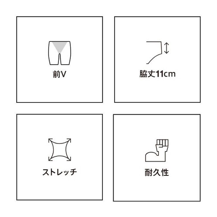 脚の動きを妨げないショート丈(脇丈11cm )。フロントV字に裏地が付いています。