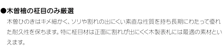 厳選した木曽檜の柾目のみを使用。日本家屋には最適な国産天然木表札です