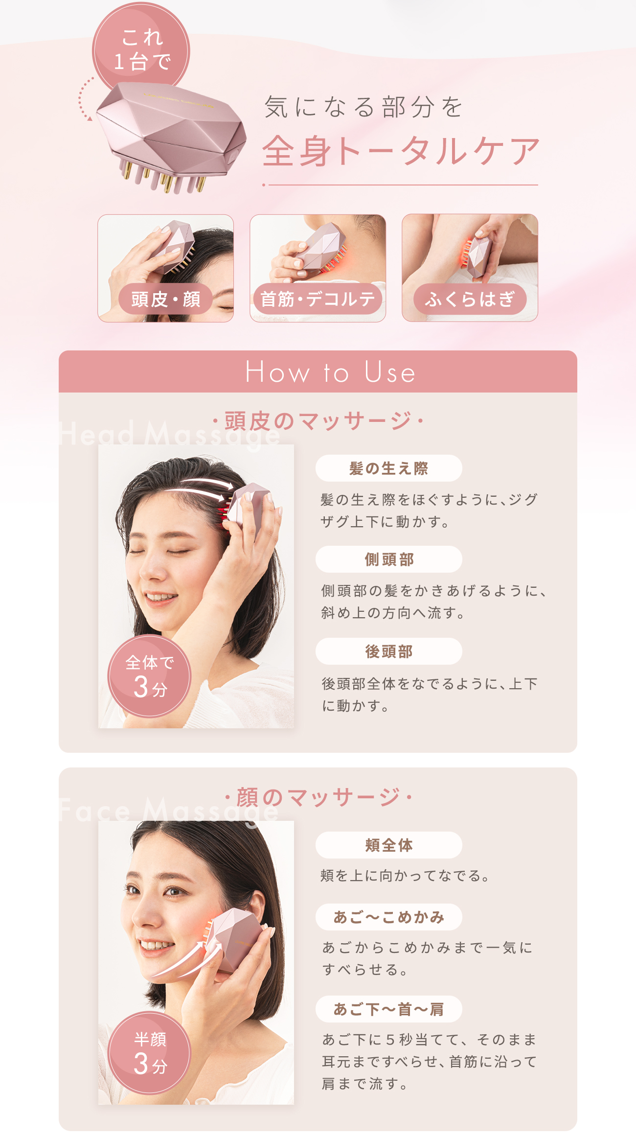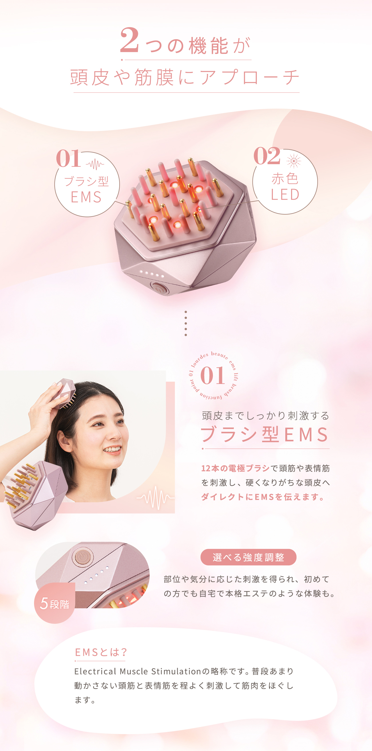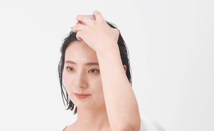 EMSと赤色LEDで頭や顔につながる頭皮や筋膜にアプローチする美容器。手の平におさまる軽量コンパクト設計。握りやすいので、初めての方でもしっかり頭皮をとらえてケアできます。