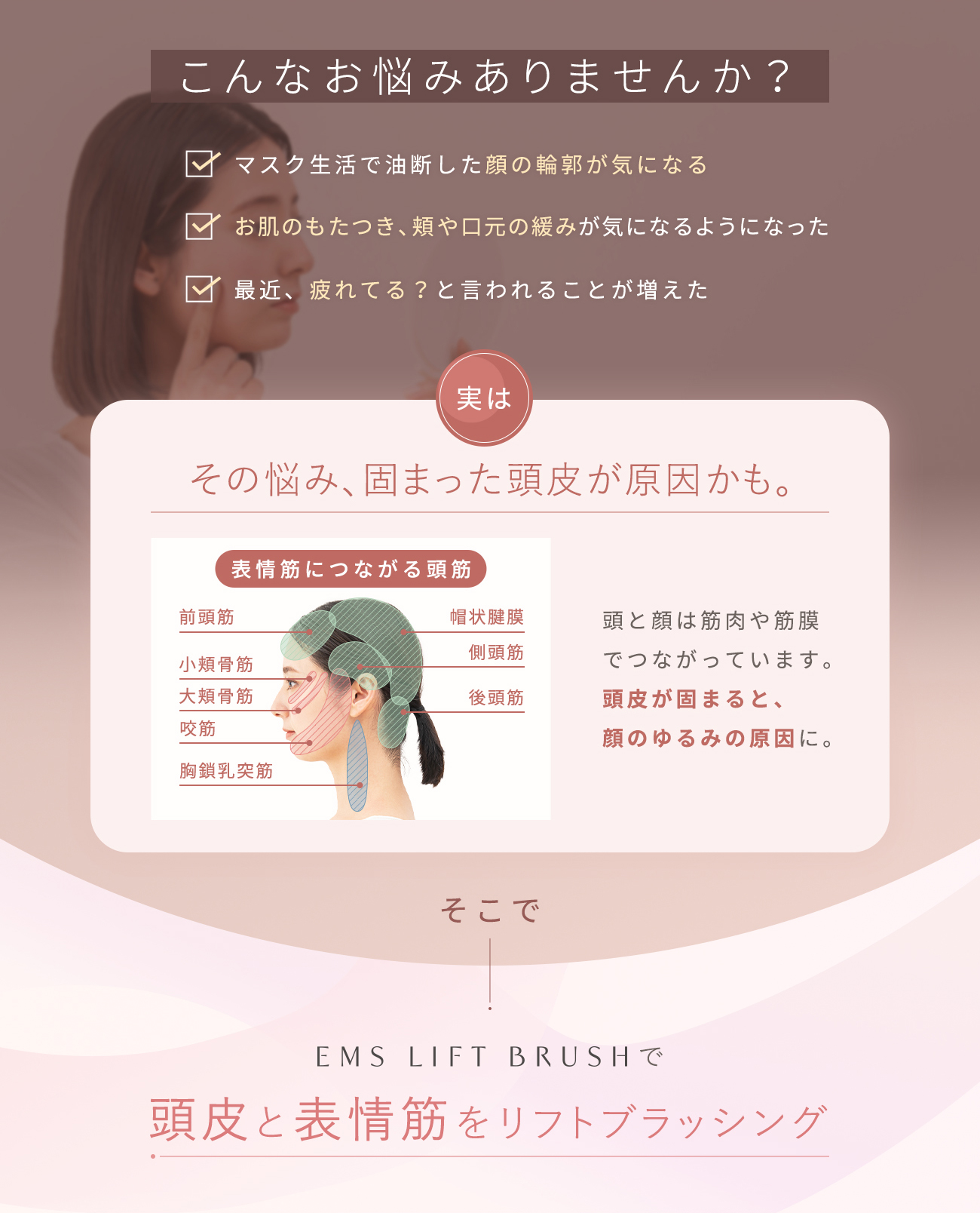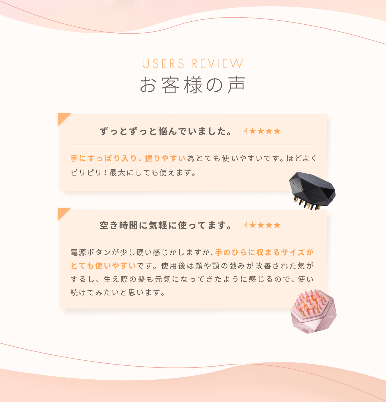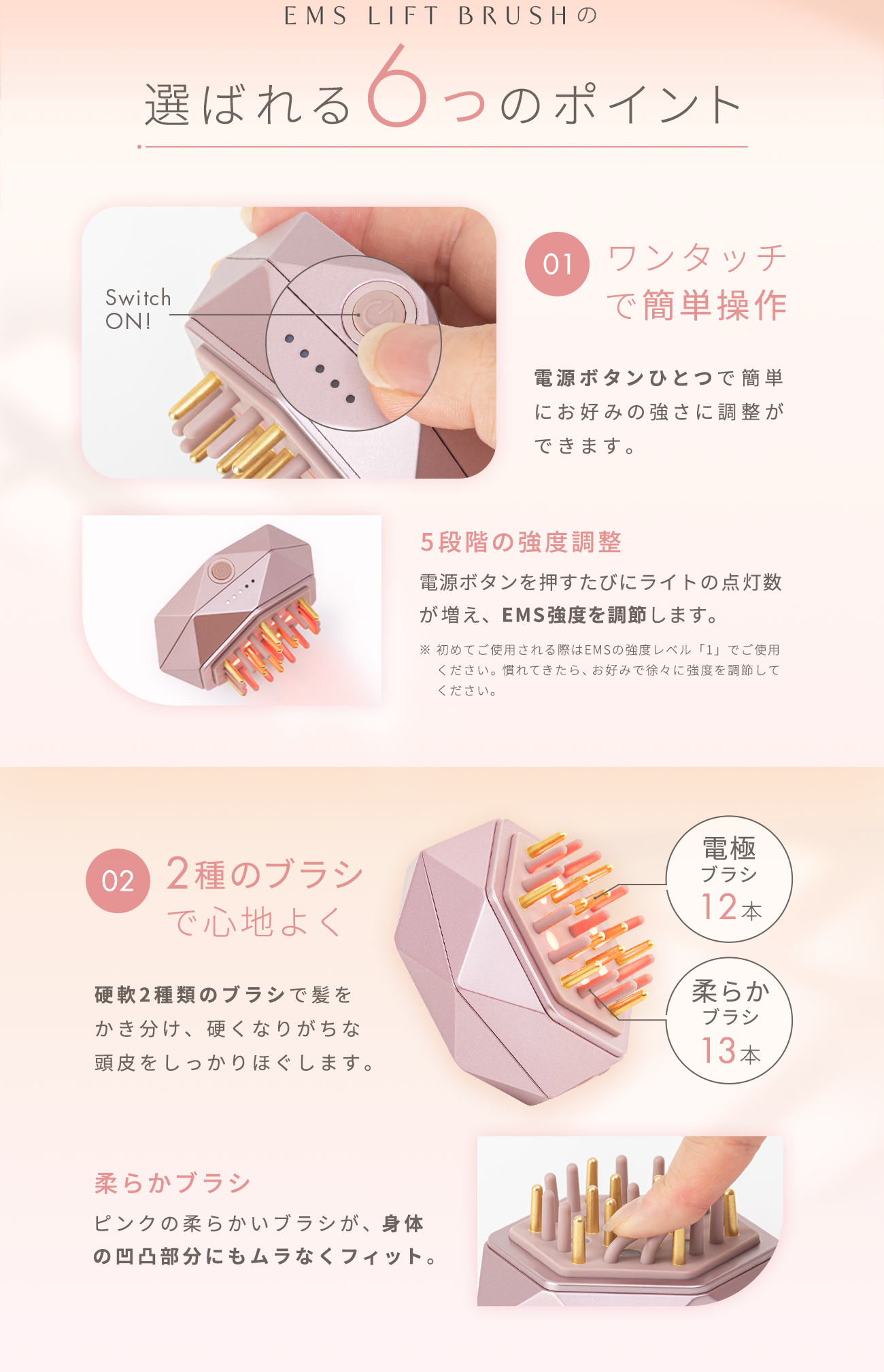 EMSと赤色LEDで頭や顔につながる頭皮や筋膜にアプローチする美容器。手の平におさまる軽量コンパクト設計。握りやすいので、初めての方でもしっかり頭皮をとらえてケアできます。