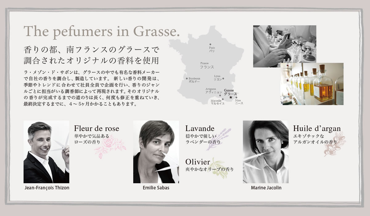 ラ・メゾン・ド・サボン社はグラースの中でも有名なパフューマリーで自社の香りを調香し製造しています。