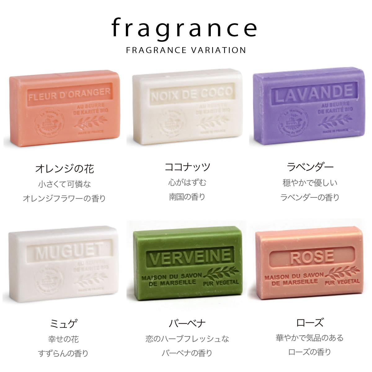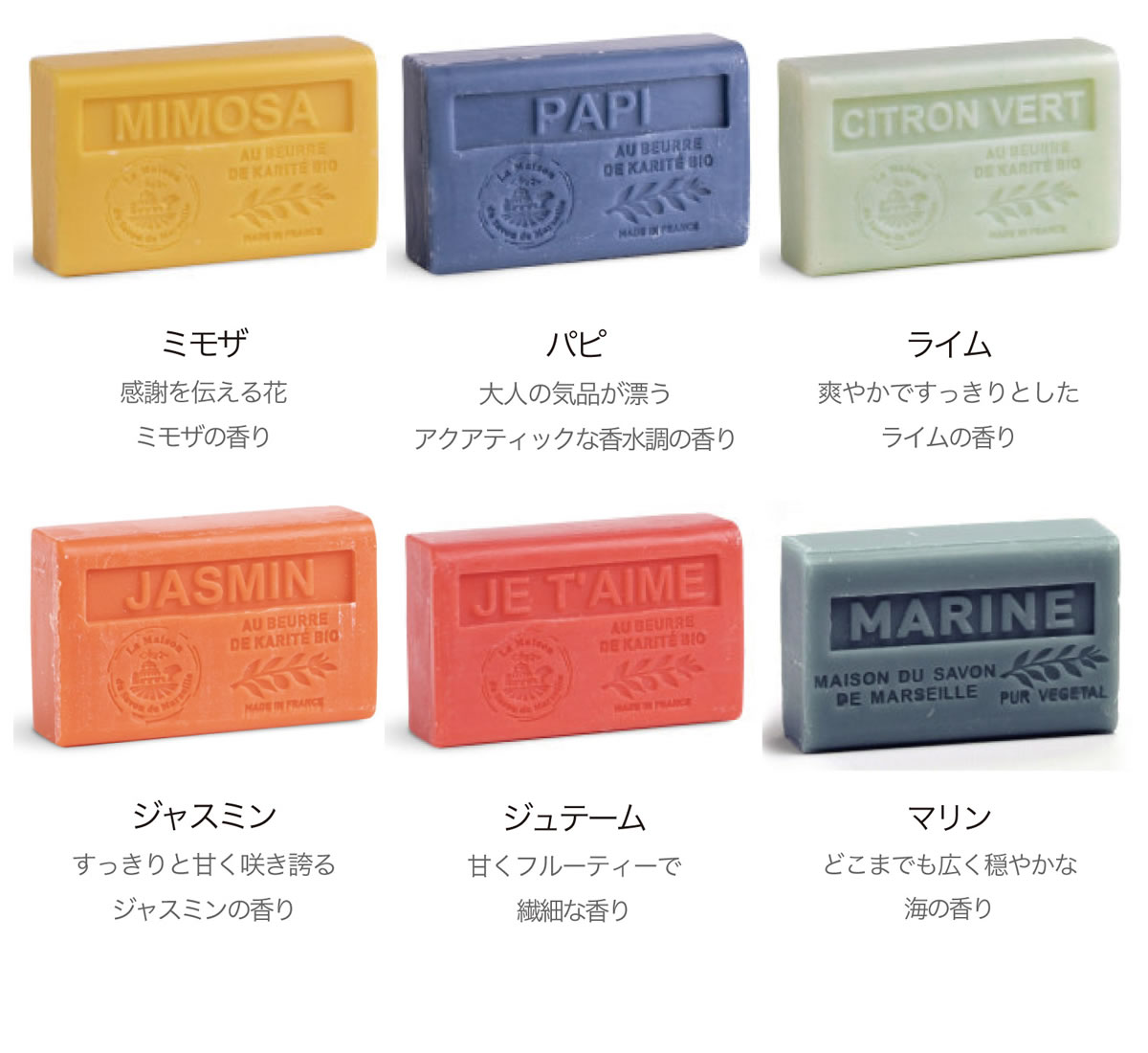 オレンジの花、ココナッツ、ラベンダー、ミュゲ、バーベナ、ローズ、ミモザ、パピ、ライム、ジャスミン、ジュテーム、マリン、プロヴァンス