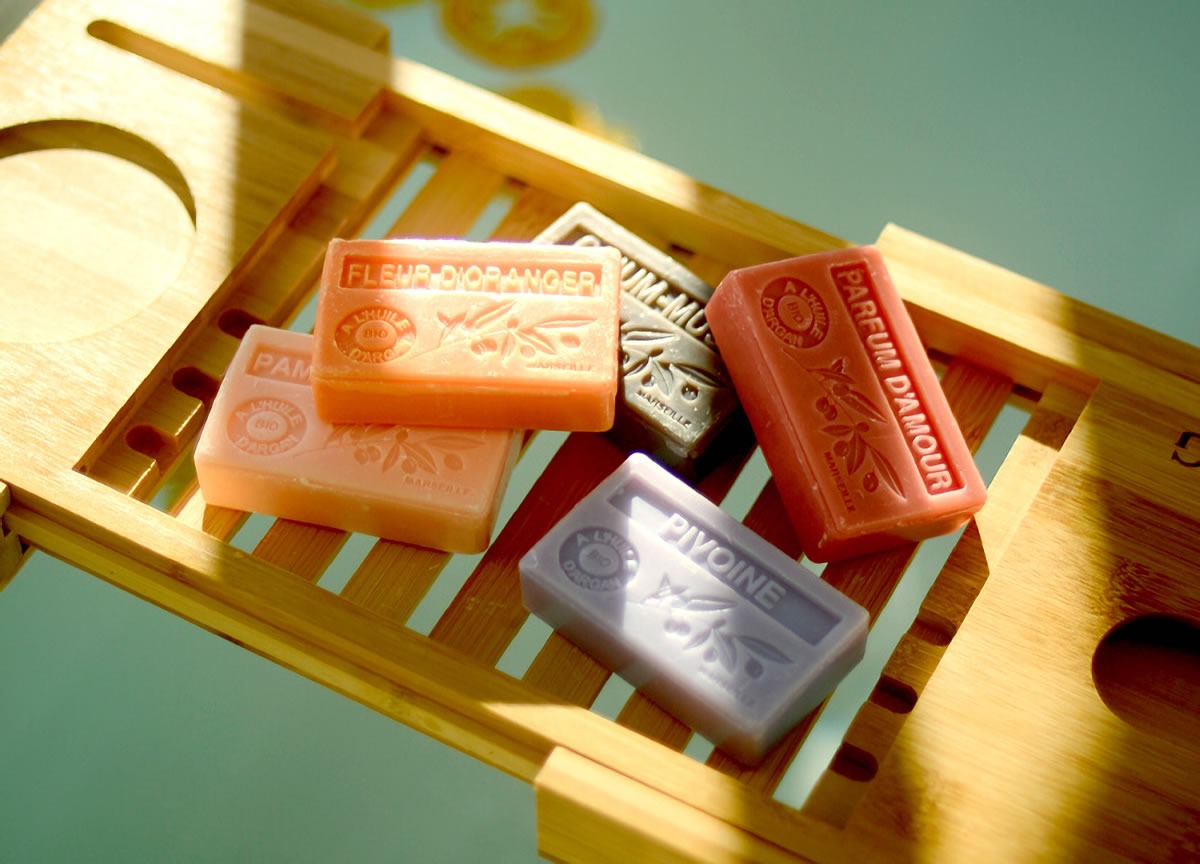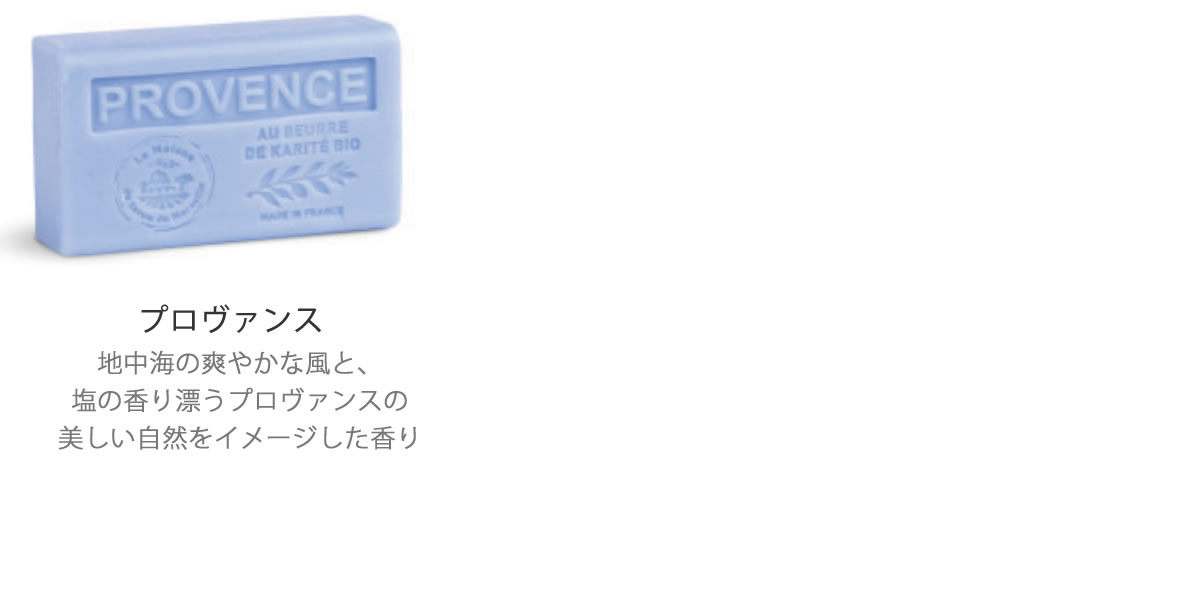 シアバターを配合したプロヴァンスの石鹸は、色とりどりで香り高く、毎日の生活に元気と潤いを与えてくれます。