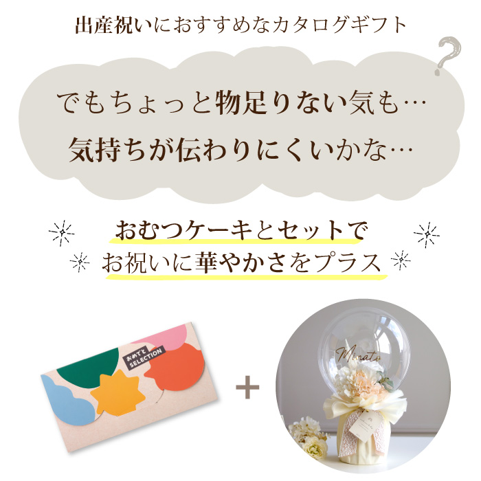 カタログギフトは好きなものを好きなタイミングでもらえる実用的なギフト。でもカタログだけだとすこし物足りない?気持ちが伝わりにくい?という方は、こちらがお勧め。カタログとおむつケーキのセットを贈りましょう!おむつケーキはそのままインテリアとして飾れるバルーン花束タイプ。エレガントで上品なアートフラワーが入ったバルーンおむつケーキはお部屋を華やかに演出します。