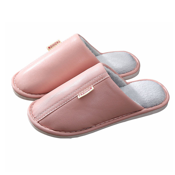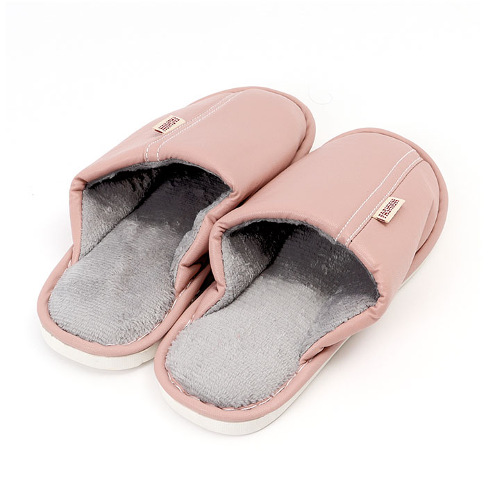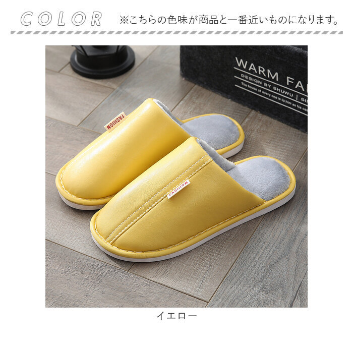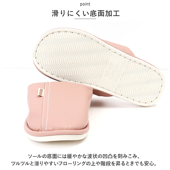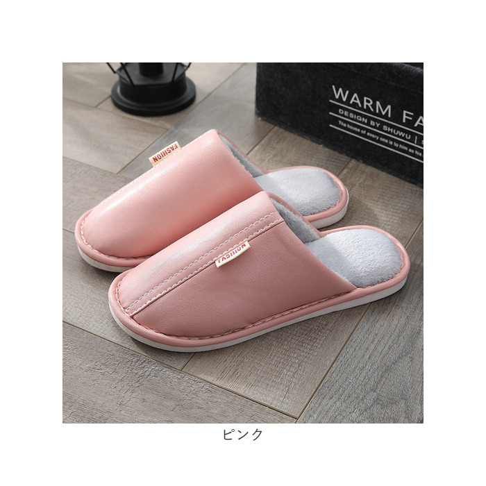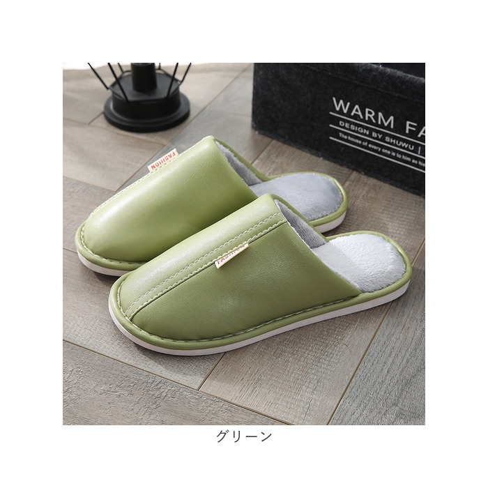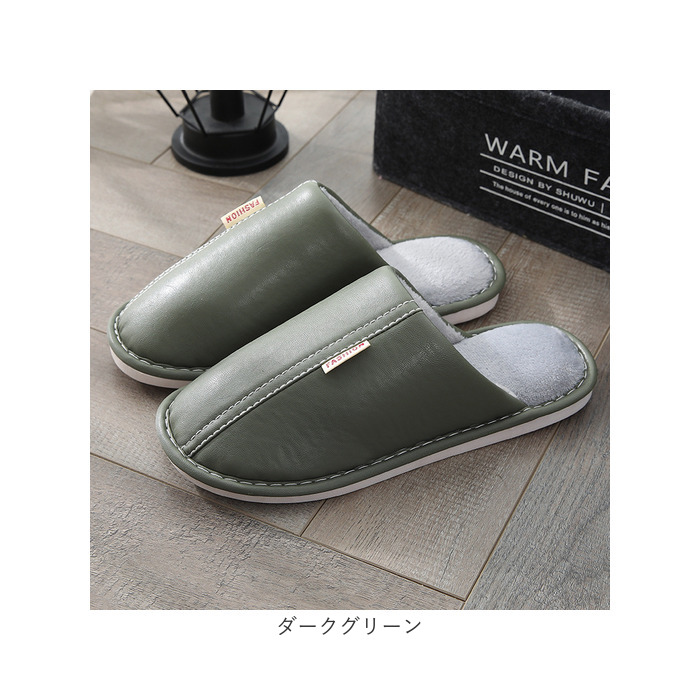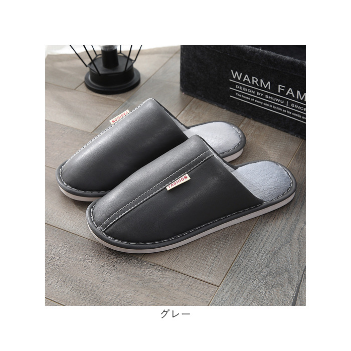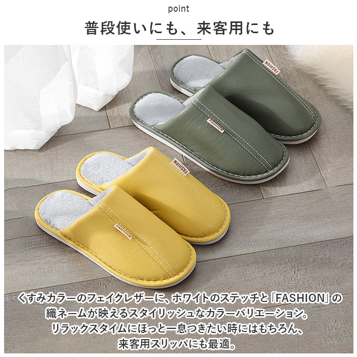 ・くすみカラーのフェイクレザーに、ホワイトのステッチと「FASHION」の織ネームが映えるスタイリッシュなカラーバリエーション。リラックスタイムにほっと一息つきたい時にはもちろん、来客用スリッパにも最適。