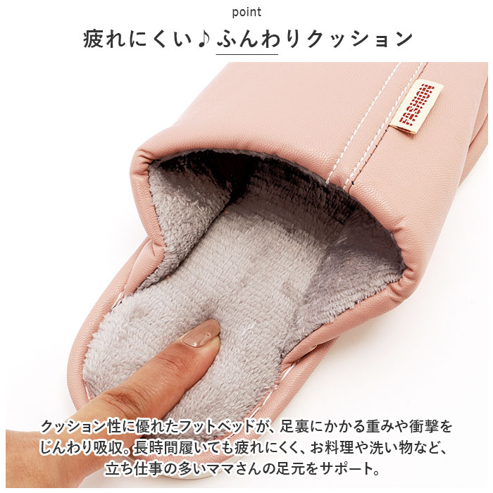 ・クッション性に優れたフットベッドが、足裏にかかる重みや衝撃をじんわり吸収。長時間履いても疲れにくく、お料理や洗い物など、立ち仕事の多いママさんの足元をサポート。