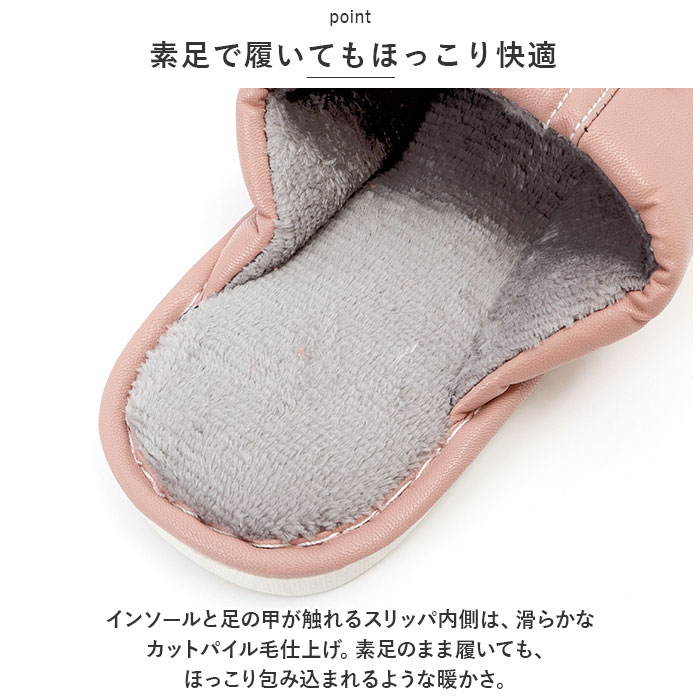 ・インソールと足の甲が触れるスリッパ内側は、滑らかなカットパイル毛仕上げ。素足のまま履いても、ほっこり包み込まれるような暖かさ。