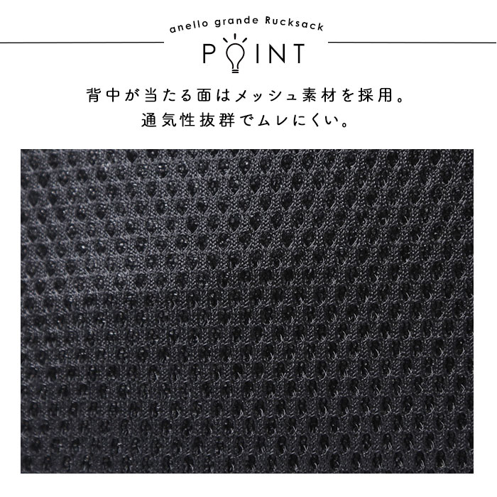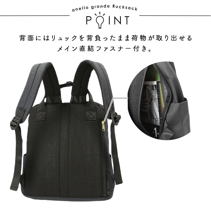 ・背面には、リュックを背負ったまま荷物が取り出せるメイン直結ファスナー付き!背中が当たる面はメッシュ素材で仕上げてあるため、通気性も抜群。
