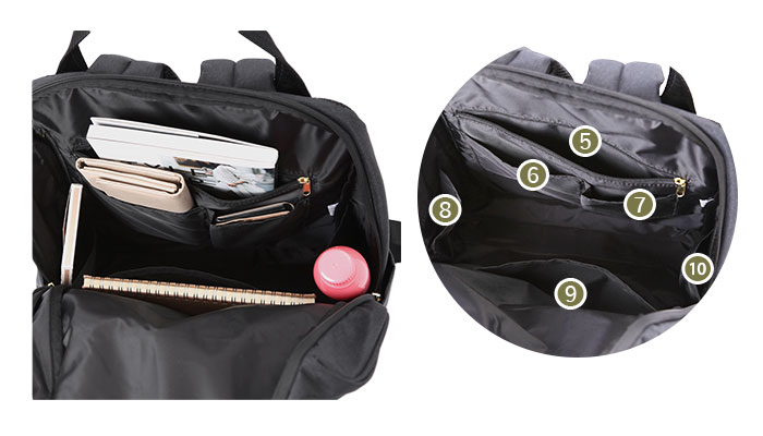 ・外側両サイドに、ペットボトルや折りたたみ傘を収納するのにちょうどいいオープンポケット×各1付き。便利に使える全10ポケット仕様!