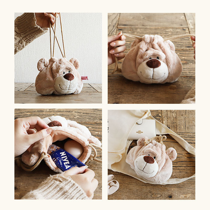 ・巾着の中に小物を詰めることで、ポーチがふっくらと丸みのある、よりぬいぐるみらしいフォルムに変身!腕に掛けて持っているだけで、道行く人が振り返る抜群の可愛いらしさ♪