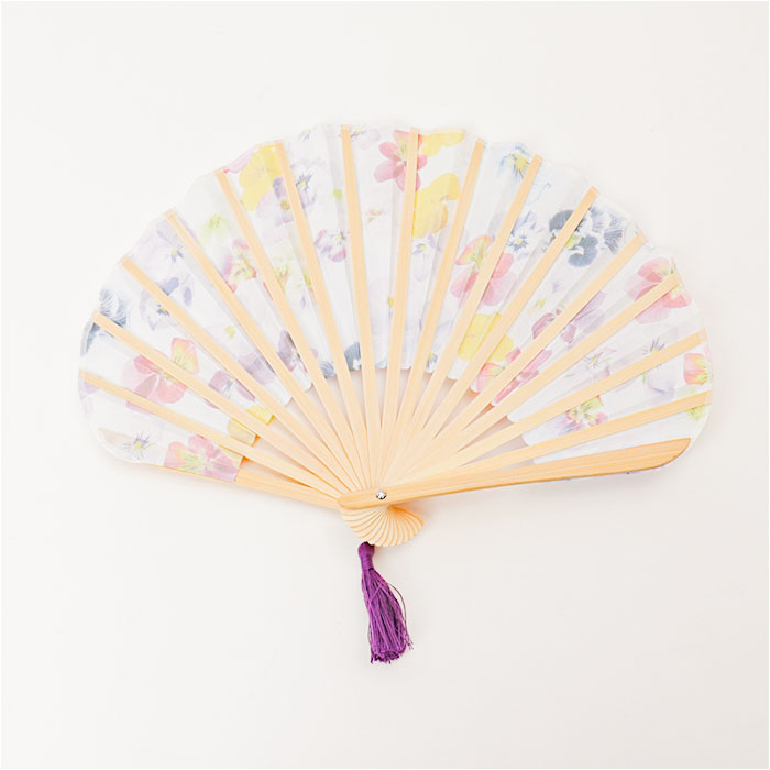 ・扇面の生地には、パンジーやトルコキキョウ、ルリダマアザミなど、様々なお花を鮮やかに散りばめ、春・夏・秋と季節の移ろいに合わせて選べるカラーバリエーション。