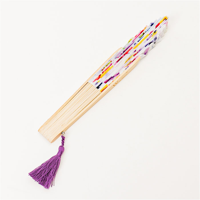 ・ナチュラルな竹材の親骨には「W by W.p.c」のブランドロゴをさりげなく刻印。扇面のモチーフカラーに合わせたタッセルがオリエンタルなアクセント。