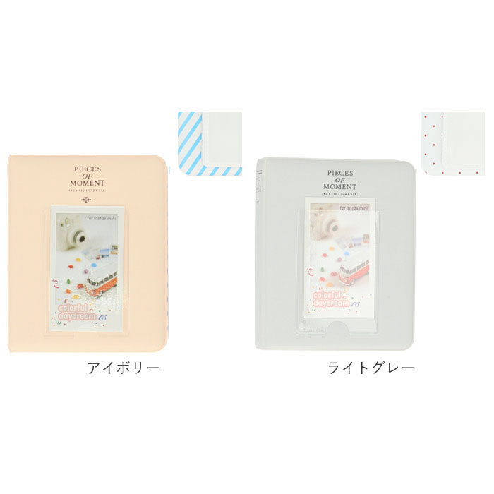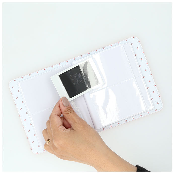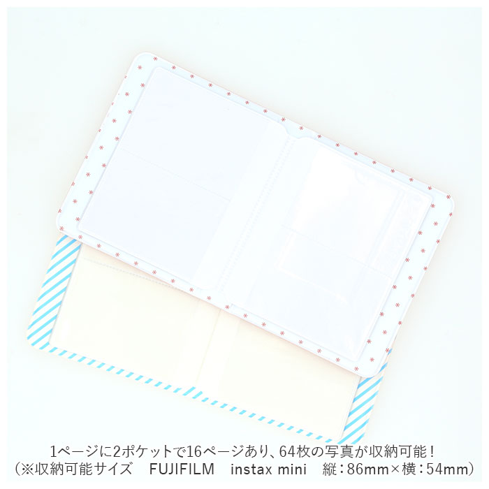 ・1ページに2ポケットで16ページあり、64枚の写真が収納可能!(※収納可能サイズ FUJIFILM instax mini 縦:86mm×横:54mm)