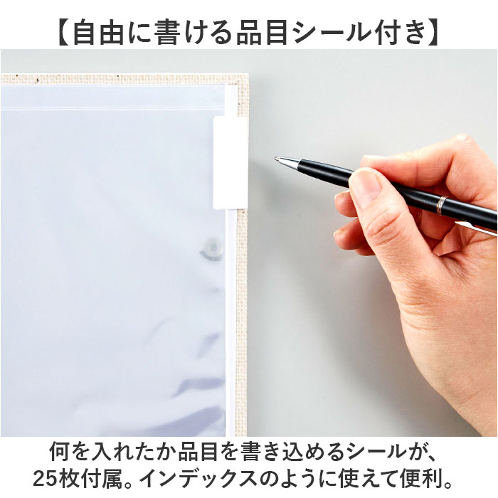 ・何を入れたか品目を書き込めるシールが、25枚付属。インデックスのように使えて便利。
