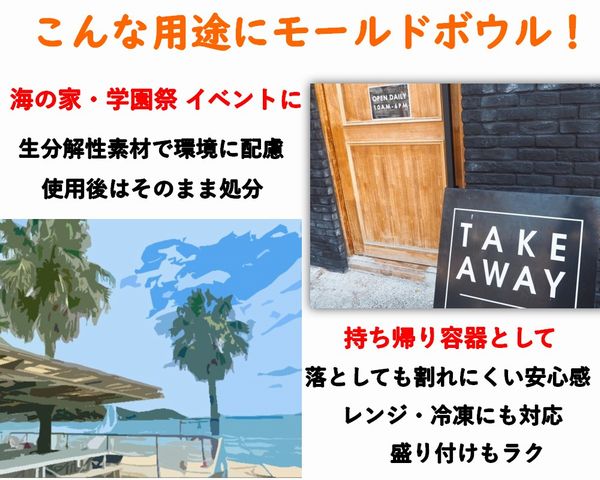 紙素材の主原料は木を使用していますが、モールド容器はサトウキビの「絞りかす」を使用。素材を無駄なく使う事に竹の皮と似た理念を感じ、販売をしました!!