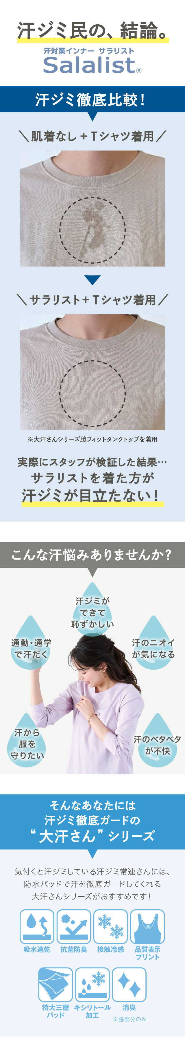 脇汗・汗ジミ・汗のベタベタやニオイなど、汗のお悩みを解消し、快適に過ごせるよう開発した、ベルメゾンオリジナルの汗取りインナーシリーズです。