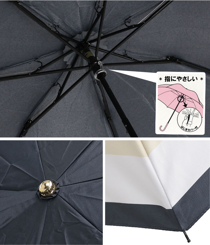 傘を開くときに指を痛めないように、はじきカバーがついているのも嬉しいポイントです。箔押しのブランドロゴやパーツのゴールドの使い方がおしゃれ♪