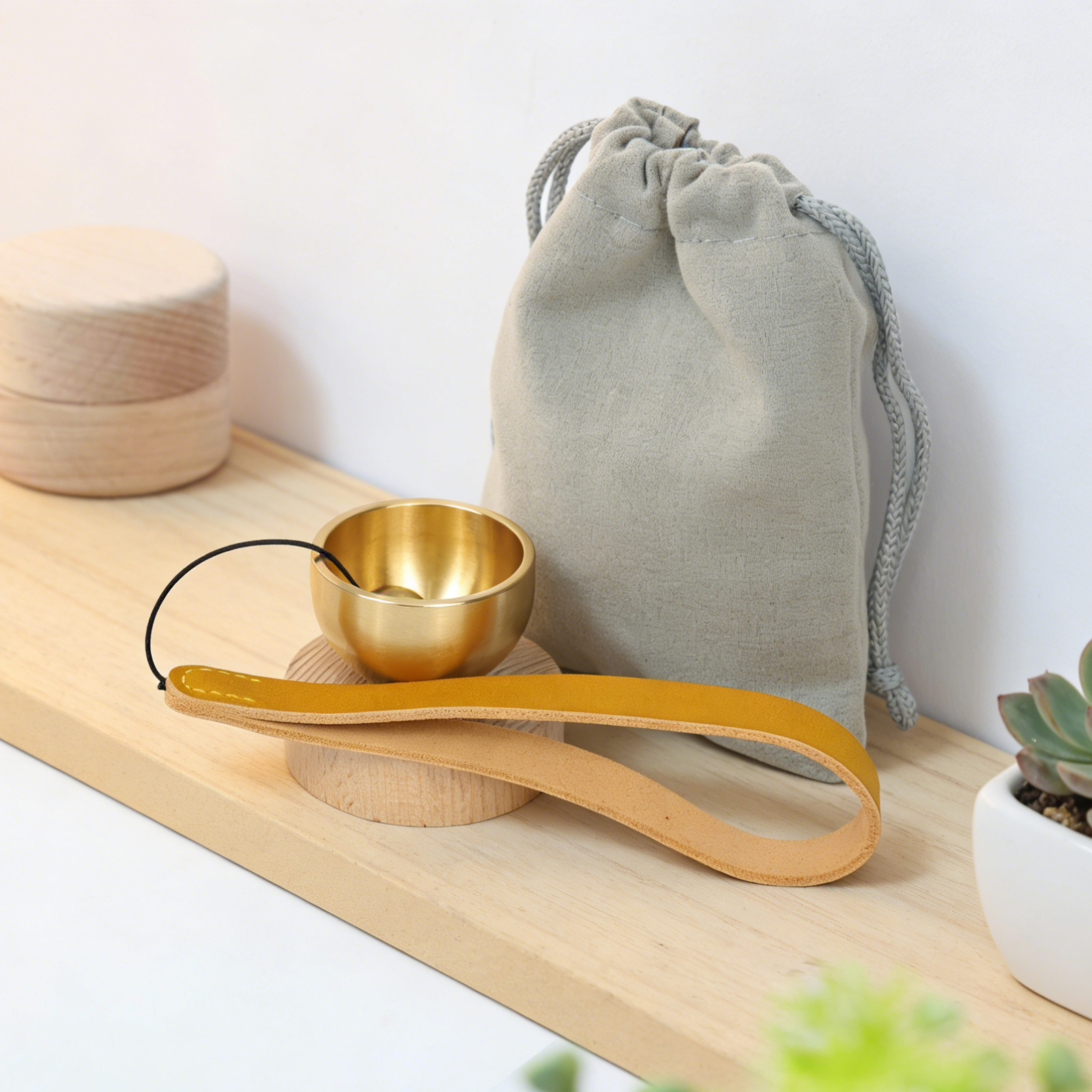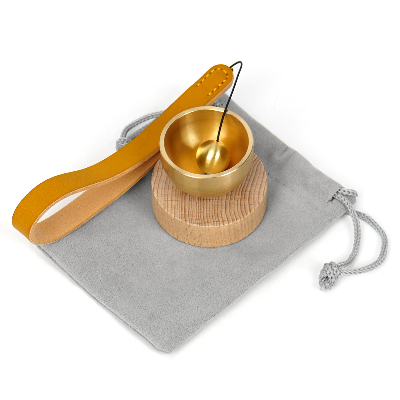 セット内容:おりん(真鍮)本体、りんリストバンド (皮革&真鍮)、天然木の台座、巾着収納袋