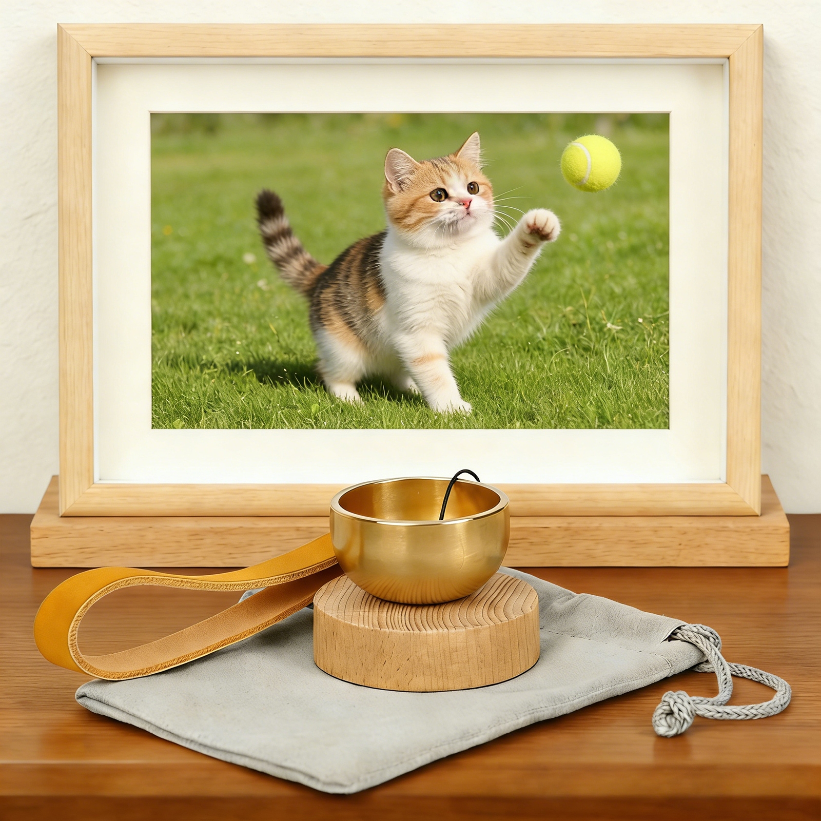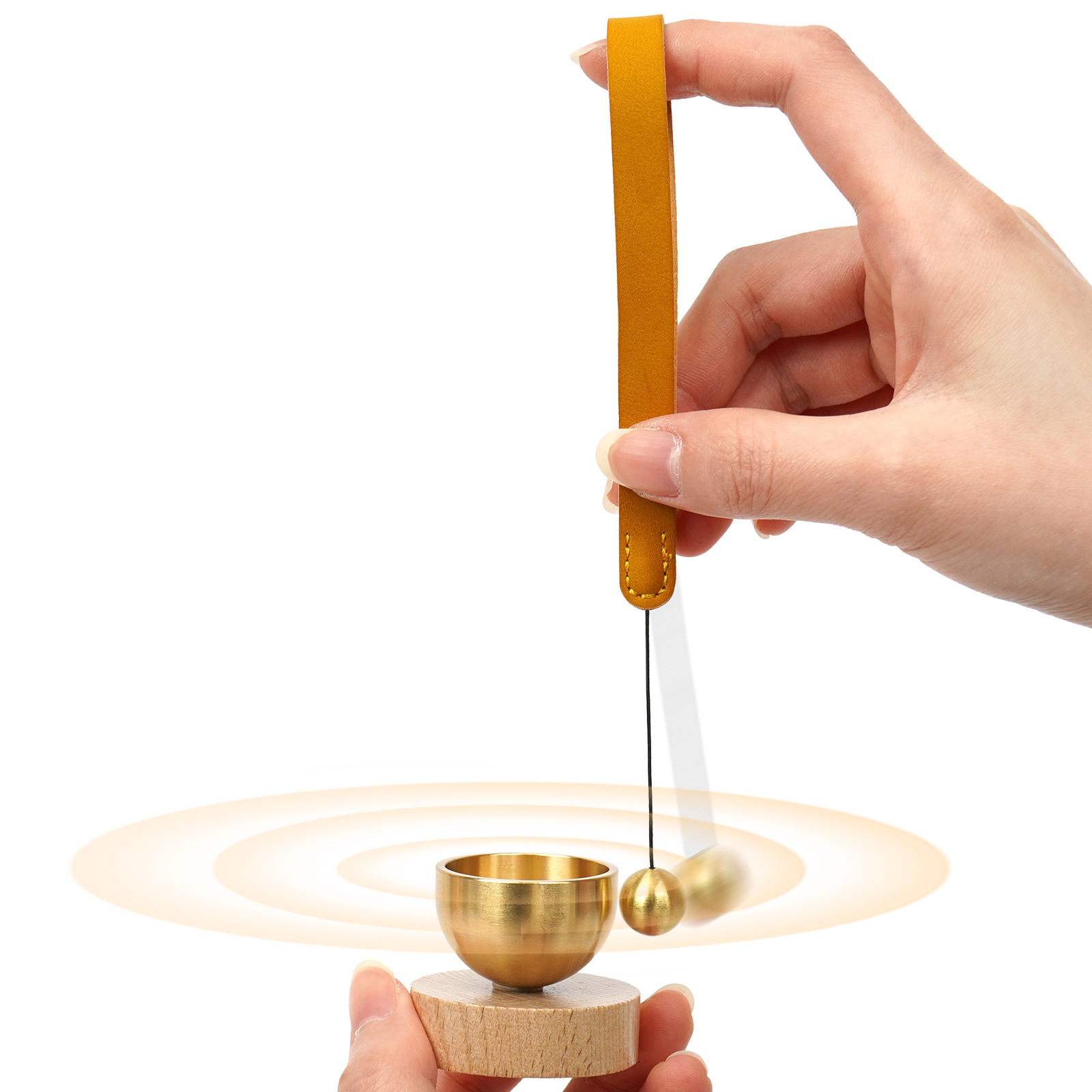 おりんを置き、りんのリストバンドを手に提げ、銅製の玉でおりんを優しく叩き、澄み渡る音とその長い余韻をお楽しみください。