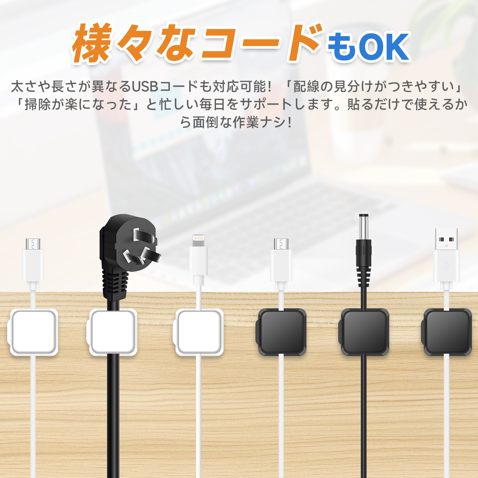 太さや長さが異なるUSBコードも自由に調整可能!「配線の見分けがつきやすい」「掃除が楽になった」と忙しい毎日をサポートします。貼るだけで使えるから面倒な作業ナシ!