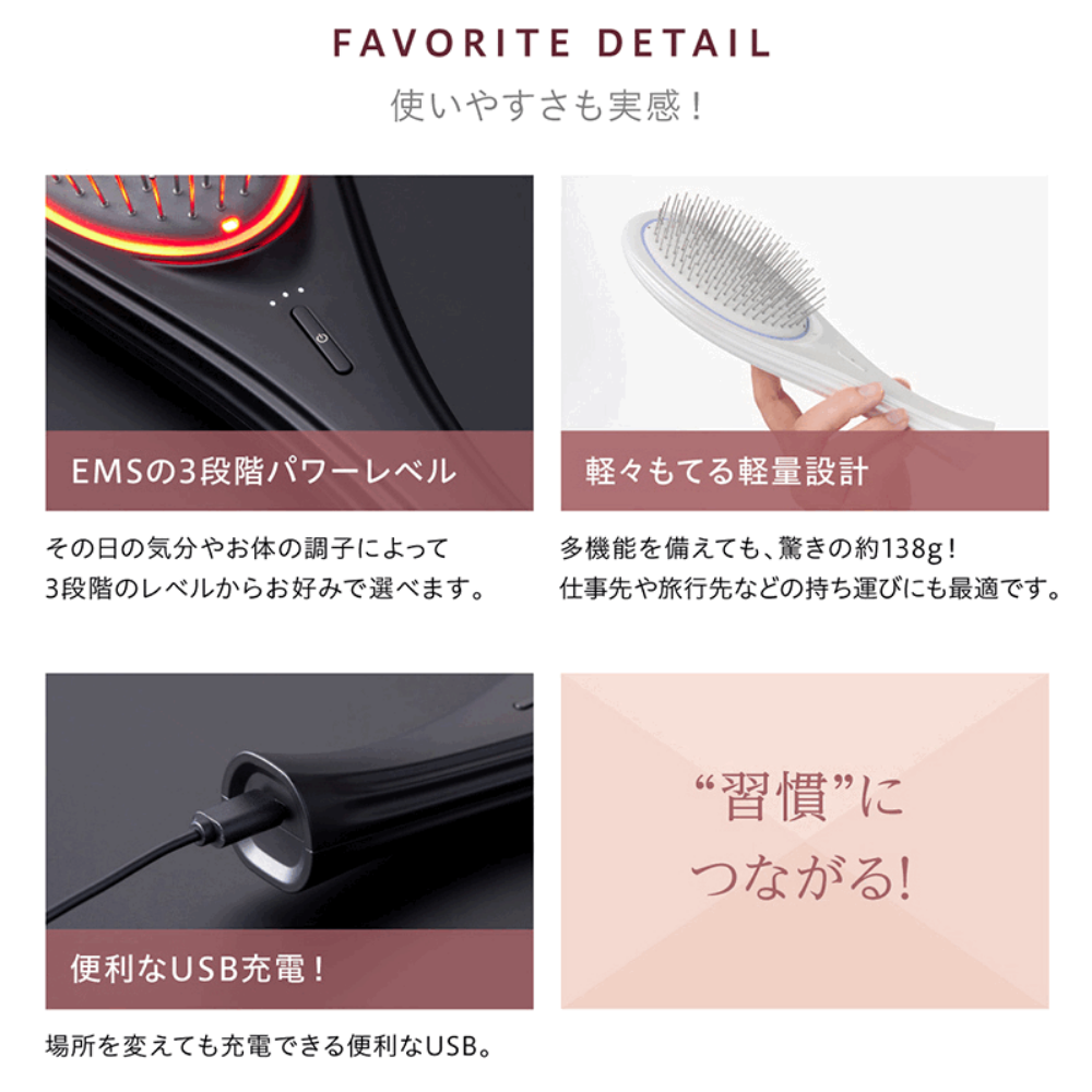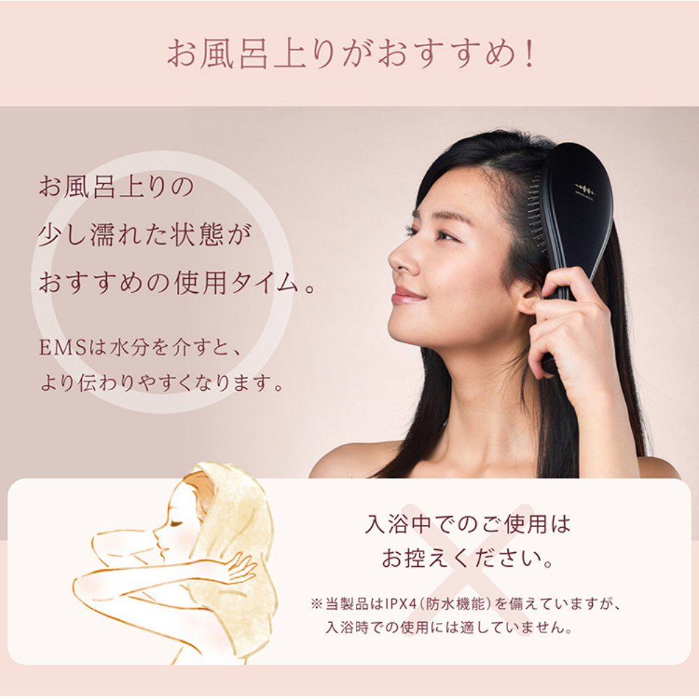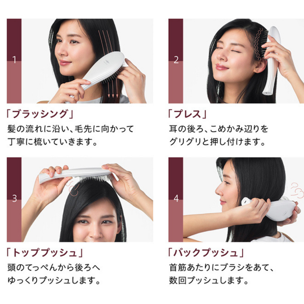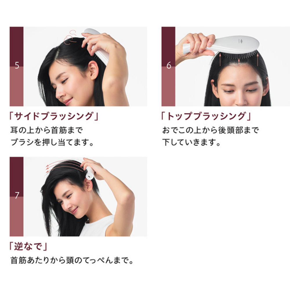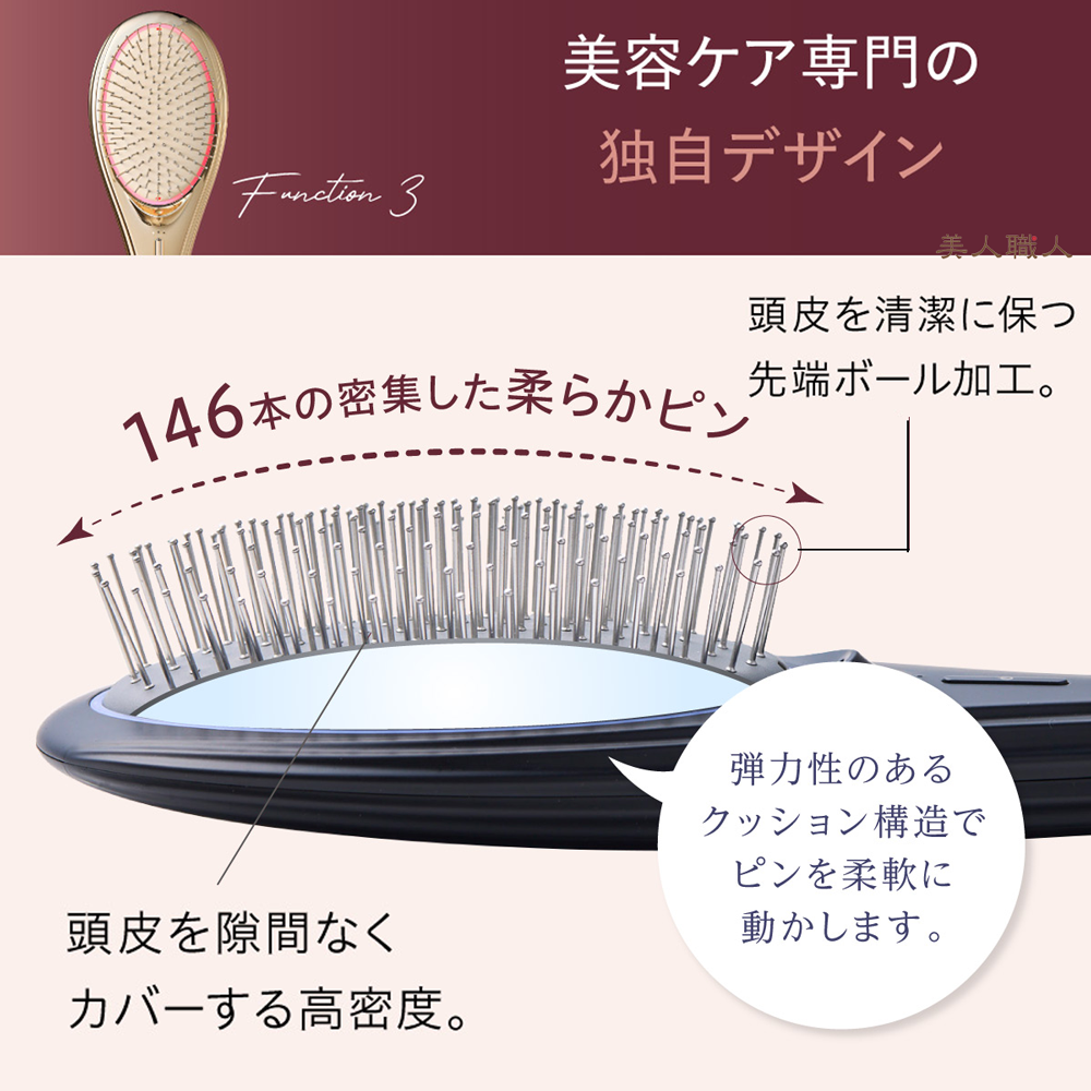 緻密な計算により配置された146本の密集したブラシピンで、頭皮を隙間なくカバー。弾力性のある クッション 構造でピンを柔軟に動かし、 EMS ( 低周波 )をやさしく伝えるとともに、マイナスイオン で潤いを含んだ髪を根元からしっかりブラッシングすることで髪全体がまとまります。