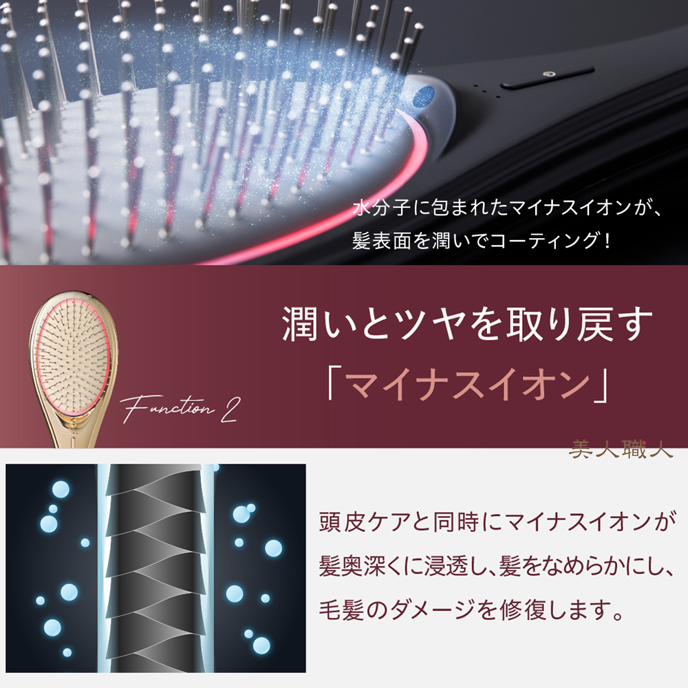 毎日のスタイリングやブローに欠かせない人気のクッションブラシと昨今美容業界でも注目される EMS の初のコラボレーション。146本の柔らかなピンと土台になるクッションの効果が相まって、EMS と マイクロカレント の 頭皮 への浸透率がUP!従来のブラシや 電気ブラシ と異なり、クッションの柔軟性があるため、 頭皮 を傷めず、やさしくEMSを伝えます。ブラシから放出される マイナスイオン が キューティクル に潤いを与え、そのままキープ。またエステレベルの 赤色 LED を照射することで、頭皮のめぐりをサポートし、「内からのキレイな髪」をご実感いただけるはずです。