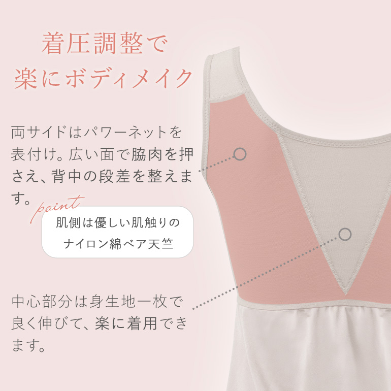 背中中心は締めつけを抑えて楽な着用感に。背中のパワーネットは表付け仕様とし、肌側はナイロン綿ベア天竺素材で、優しい肌触りです。