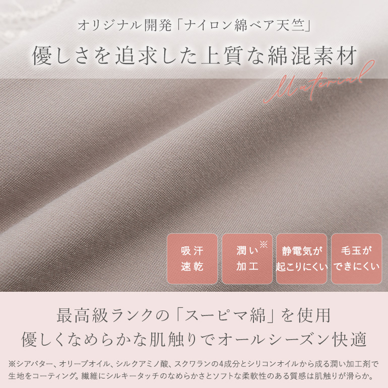 吸汗・速乾性があり、毛玉・静電気が起こりにくく、接触冷感と潤い加工で快適。