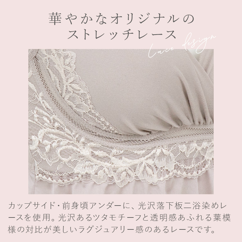 刺繍のような存在感のある、光沢落下板二浴染めストレッチレースを贅沢に使用した、補整ノンワイヤーブラスリップです。