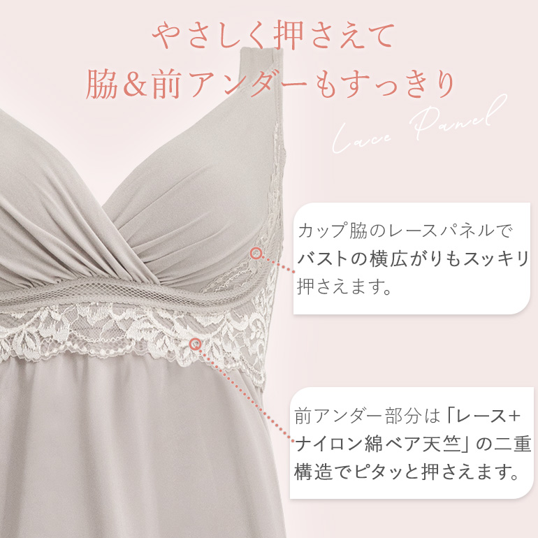 「カップ脇伸縮パネル」でカップ容量を調節。ナイロン綿ベア天竺の伸縮によって、様々なバストサイズに対応。
