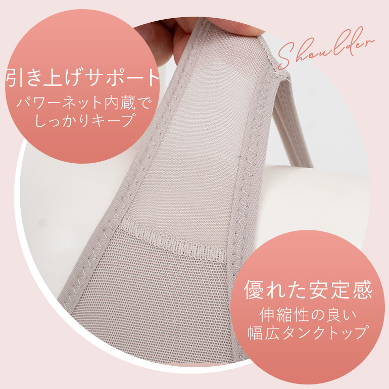 肩接ぎ線を後側にずらした設計で肌触りをやさしくし、接ぎ部分はパワーネットを省いて柔らかさと伸縮性を向上。
