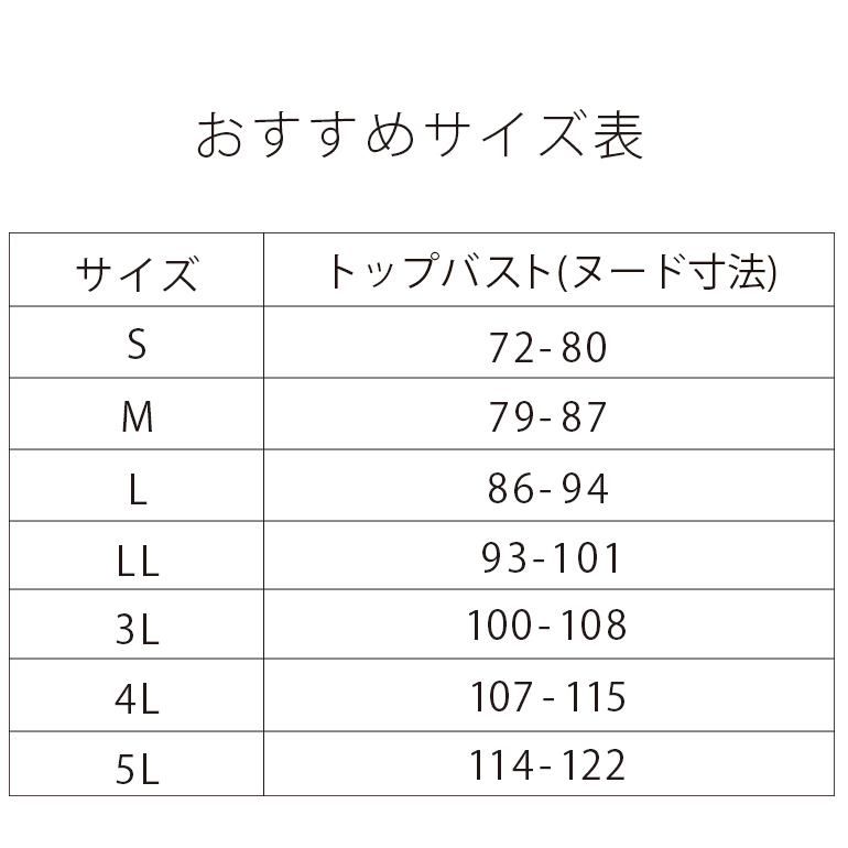 S(72-80)・M(79-87)・L(86-94)・LL(93-101)・3L(100-108)・4L(107-115)・5L(114-122)