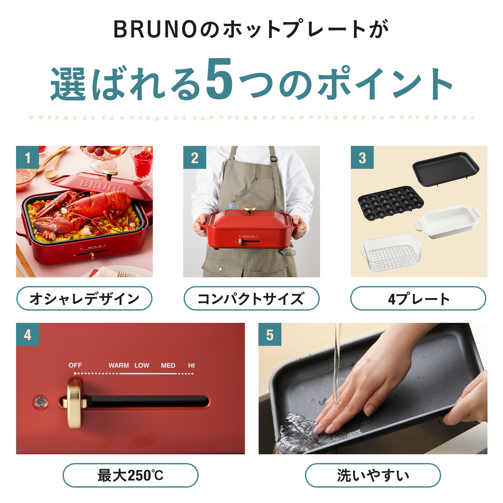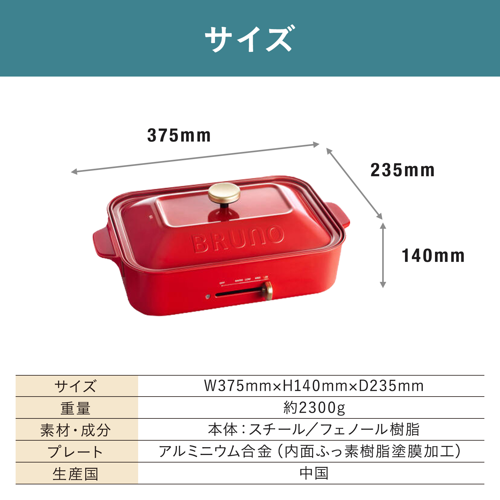 ・コンパクトホットプレート:W375mm×H140mm×D235mm、約2300g、コード長:約1.8m、重量は平面プレート、フタ使用時/たこ焼きプレート使用時