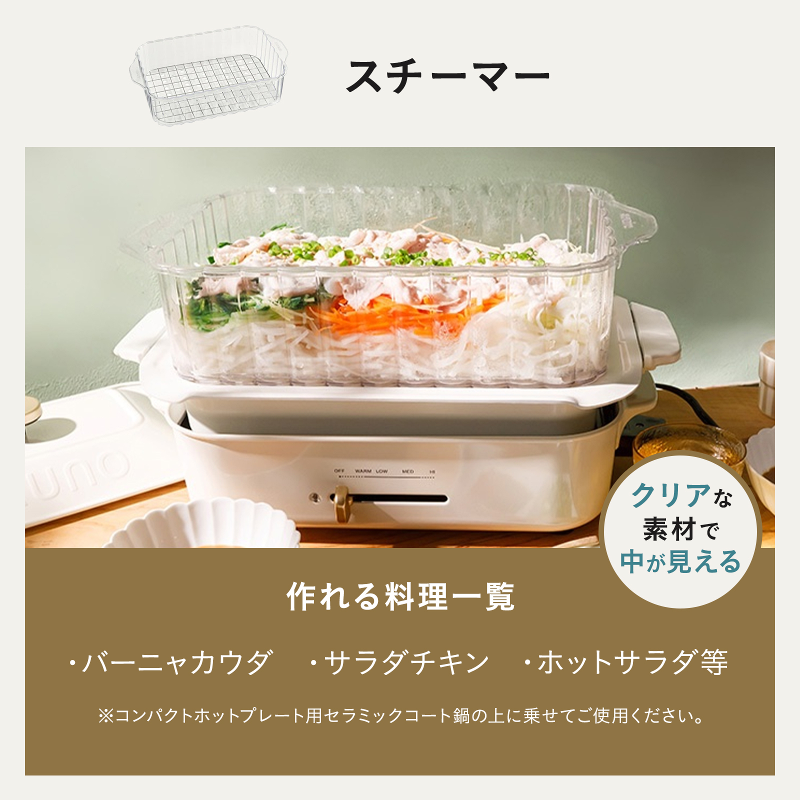 ・スチーマー:本体:コポリエステル樹脂、付属網:ステンレス鋼