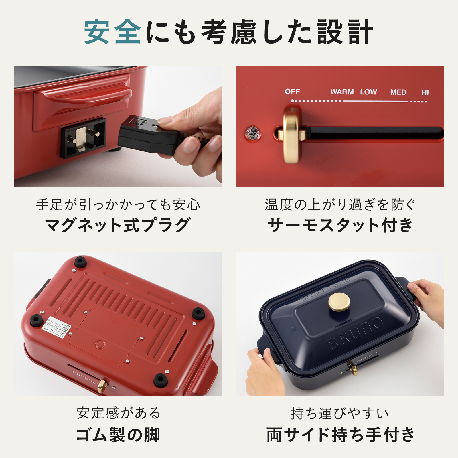 ・コンパクトホットプレート:定格消費電力:1200W、プレート取り替え式、温度調節(65℃〜250℃)、安全装置(サーモスタット/温度ヒューズ)、フッ素樹脂コート