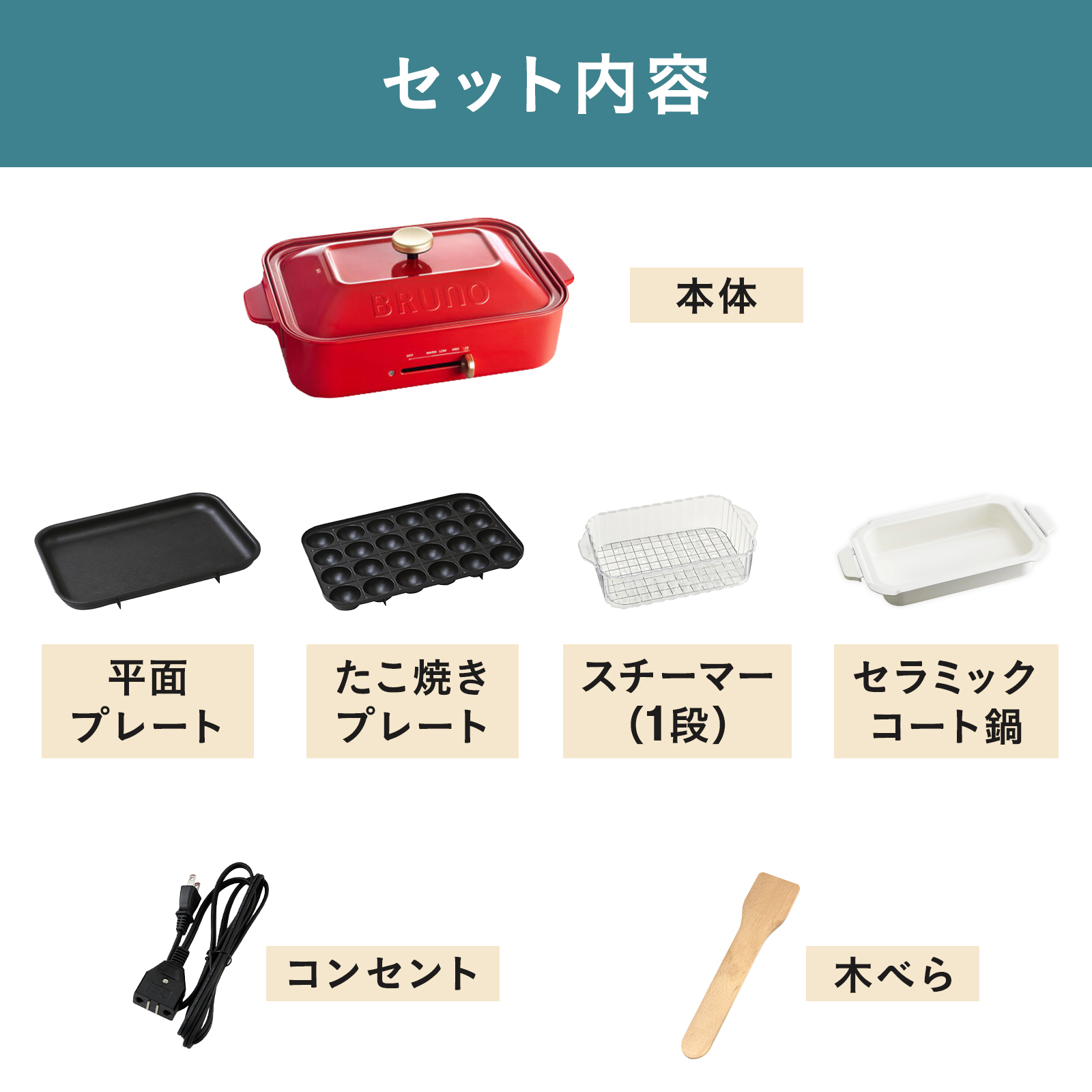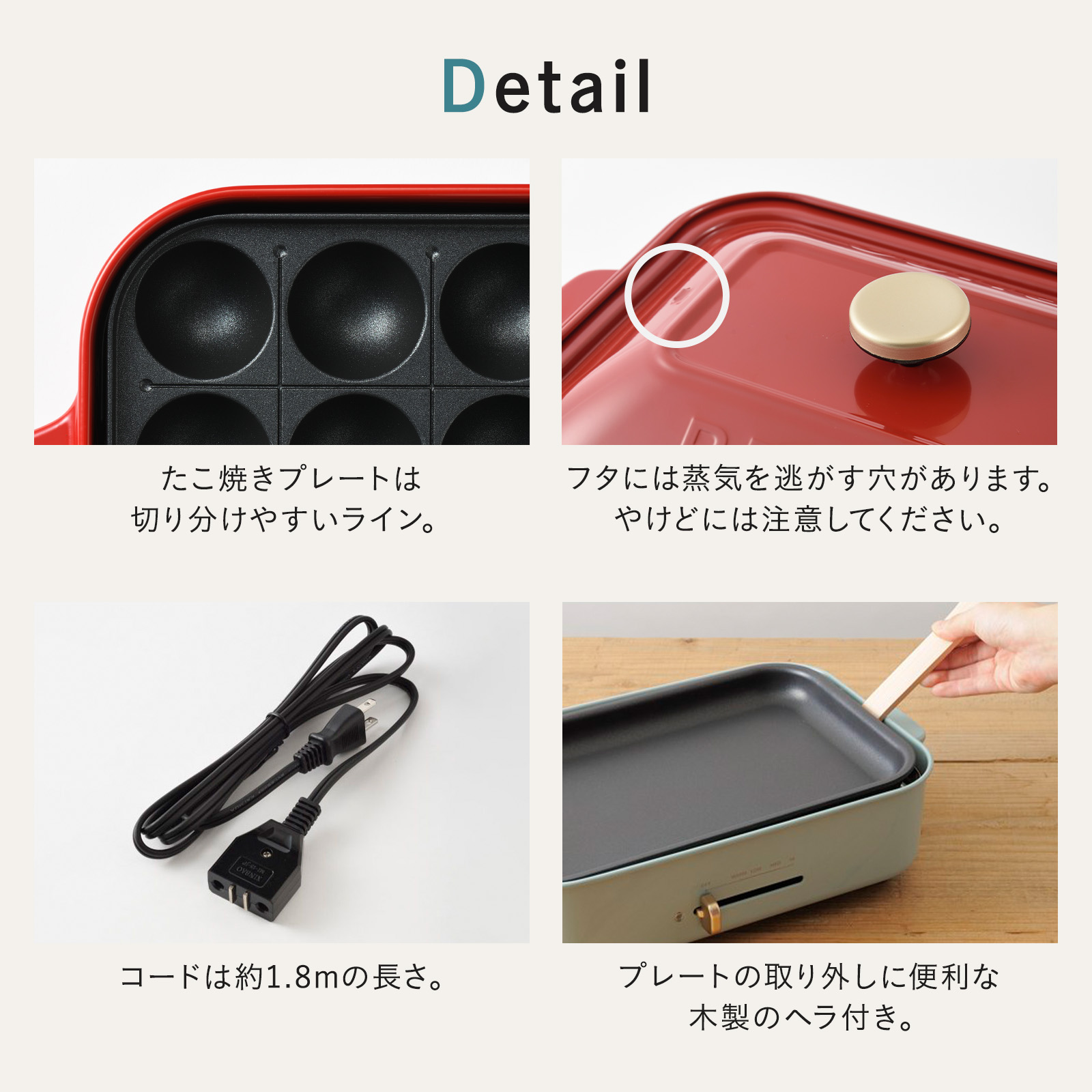 平面プレート、たこ焼きプレート、セラミックコート鍋、木べら、マグネット式脱着電源コード
