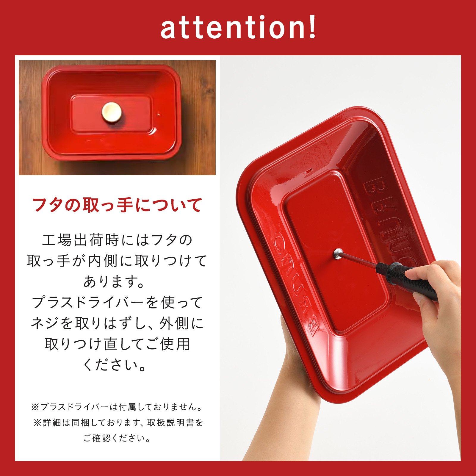※工場出荷時にはフタの取っ手が内側に取りつけてあります。ネジをはずし外側に取りつけ直してください。