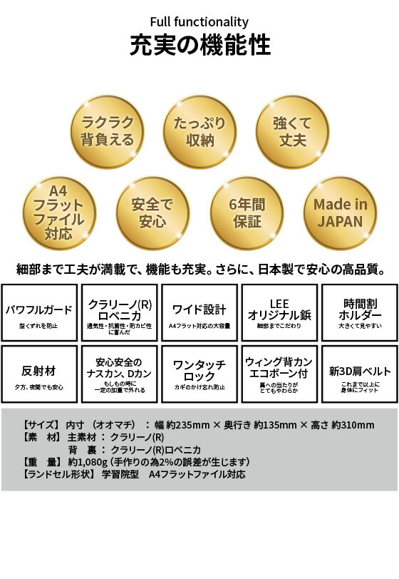 ※ランドセルは縫製品のため、サイズ・重さに誤差がございます。