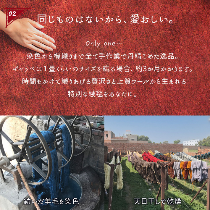 天然羊毛。ウール100%のハンドメイド。インドの職人が丁寧に織り上げたゴージャスなラグです。