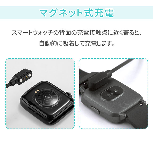 スマートウォッチの背面の充電接触点に近く寄ると、自動的に吸着して充電します。