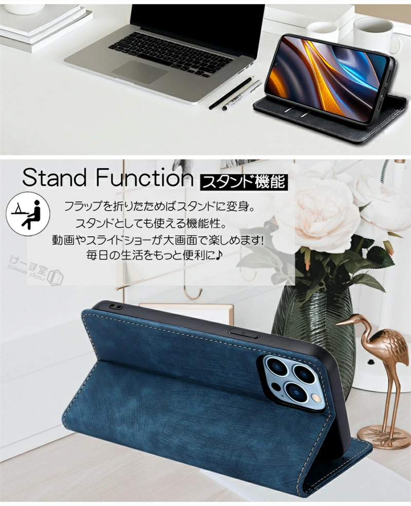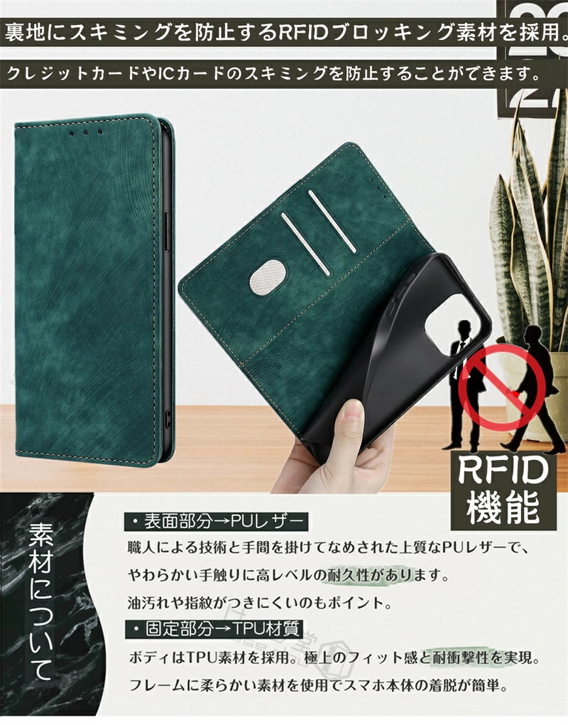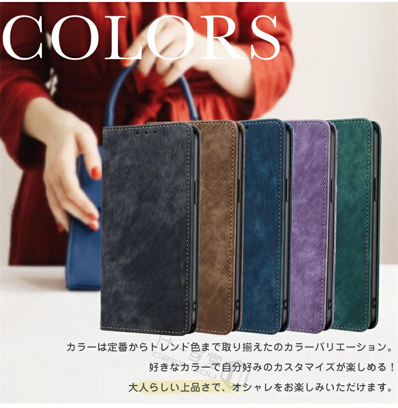 ■キャッシュレスを安全に、快適にしたい方へ。「RFID」磁気防止機能付き、持ちやすいケースが登場。■男女兼用の洗練された大人シンプルデザイン。ビジネスでもカジュアルでもお洒落に決まります。■カード入れが2つと大ポケットが付いています。手帳型スマホケースならではの充実の収納も商品の特徴の一つ。■使いやすさにこだわった「ベルトレス」。マグネット式で開け閉めラクラク。■柔軟で衝撃吸収性のあるレザー素材を使用。手触りが良く、耐久性を兼ね備えました。■スタンドとしても使える機能性。動画の視聴もラクラク。■エレガンスが引き立つ、ベーシックなデザインでプレゼントにもおすすめです。