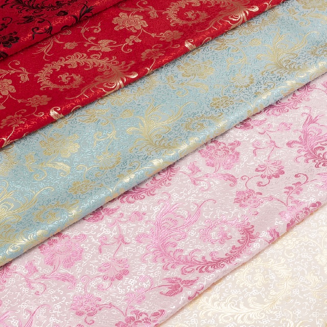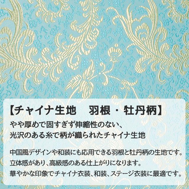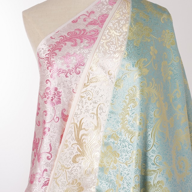 中国風デザインや和装にも応用できる生地です。刺繍風に織り込まれた柄の詰まった華やかな印象の仕上がりです。チャイナ衣装、和装、ステージ衣装に最適です。
