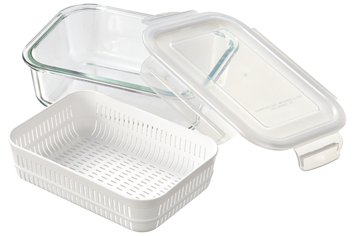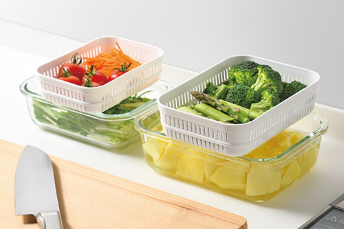 洗う・蒸す・湯切り・油切り・水切りが出来る、電子レンジ対応の角ざるが付属しています。鍋やフライパン、ざるやボウルを使わなくても、これ1つで様々な調理・保存が可能になります。